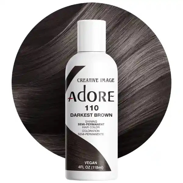 La Coloration Capillaire Semi-Permanente Adore 110 Darkest Brown infuse chaque mèche d’une couleur marron foncé intense, vibrante et lumineuse, sans utiliser d’ammoniaque, de peroxyde ni d’alcool.