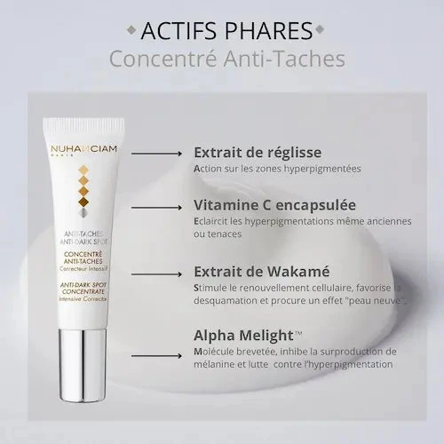 Venir à bout des taches rebelles, c’est la mission du nouveau Concentré Anti Taches Nuhanciam. Sa formule incorpore 4 actifs-clés dans la synthèse et la régulation du taux de mélanine.