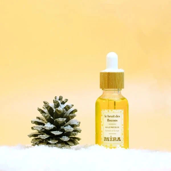 100% naturelle, l’Huile Précieuse Cannelle et Orange – Le Bruit des Flocons de Mira combine le meilleur des huiles végétales et des essences aromatiques pour revitaliser et nourrir la peau durant les mois froids ou très secs.